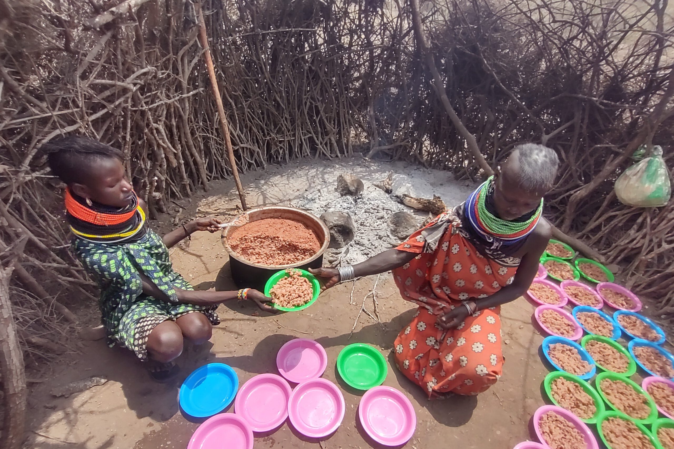 Das Foto zeigt 2 Frauen aus dem Dorf Nakolonyoi in ihrer einfachen Manyatta Küche, wie sie die Teller die BlackAndWhite gekauft hatten mit Mais und Bohnen befüllen. Die Szene spielt in einer traditionellen, runden Hütte aus verflochtenen Zweigen und Ästen, mit einer zentralen Feuerstelle, auf der Asche und ein schwarzer Topf mit dem Brei aus gelblichen Maiskörnern und Bohnen stehen. Links kniet eine junge Frau in einem grün-blau gemusterten Kleid mit farbigen Perlenhalsringen in Rot, Gelb und Blau, die einen pinken Plastikteller hält und portionsweise Essen schöpft. Rechts sitzt eine ältere Frau in einem orange-weißen gepunkteten Tuch mit ähnlichen Halsringen, die einen Löffel in der Hand hält und den Topf rührt, während sie den gefüllten Teller anreicht. Vor ihnen liegen zahlreiche bunte Plastikteller in Pink, Blau, Grün und Gelb auf dem staubigen Boden, einige bereits mit Essen gefüllt, was auf eine Verteilung an die Gemeinschaft hinweist. Die Atmosphäre ist rustikal und authentisch, mit natürlicher Beleuchtung durch Lücken in den Wänden, die die Härte des Alltags in einer arid afrikanischen Region unterstreicht, aber auch Dankbarkeit und Gemeinsinn durch die humanitäre Hilfe vermittelt.